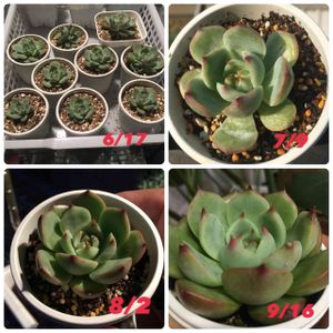 桃太郎成長記録 6/17 昨年の9月から葉挿しを初めて脱落した葉も有ったけど、何とか形になりオフ会で皆様の元に旅立つ準備😊1つだけ成長点付近が怪しかったので残る事に💦 7/9 黒くなっていた部分をピンセットでつまんだ跡が若干痛々しい😓でも何とか無事でした🎵 8/2 中から新しい葉っぱも出て来て葉っぱの厚みも増して来ました👌🏻 9/16 葉挿しから一年、2号鉢いっぱいに😊 春から直射、雨ざらしで育てたけど葉焼けも起こさず強靭な子です✨今年の夏は雨続きだったけど根腐れも起こしませんでした👍🏻 これから紅葉で楽しませてくれることを期待します✨
