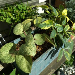-2.8℃🌅/3℃🌥️ 今朝のクリスマスローズ🌿 1️⃣2️⃣ステルニー カレイドスコープ ザ ロッキーズ シルバーリーフに黄色みのある斑が入り🌿🩶💛 どことなくレトロ感を感じる🧸 イチオシカラーリーフです🎖️ 3️⃣ステルニー ベイクドクッキー 4️⃣ネオゴールデンリーフ ↑ 1年目の2株は いろんな色の葉っぱがランダムに🟢🟡🟤 似ています👯 5️⃣ステルニー スーパーシルバー シルバーというより、 丁寧にホワイトを混ぜたエメラルドグリーン💎かな!?