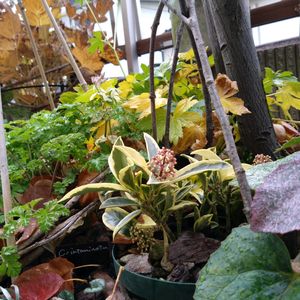 1.6℃🌅/10℃🌧️ スキミア マジックマルロー🪄 3回目の冬は☃️🗓️3️⃣ スリット鉢in花壇ですごします🏡🧱 お迎え時から、ちっとも大きくなっていませんが🙄 つぶつぶのツボミが3つつきました♪♪♪