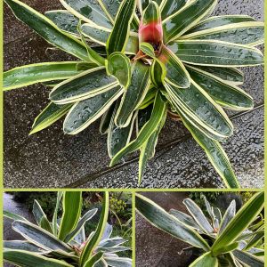 ■Neoregelia sp ・ネオレゲリア パイナップル科ネオレゲリア属 名無しのネオレゲリアsp。ネットで似てる品種を探したら、大振りな葉と白覆輪・白斑が特徴の「Neoregelia Madame Vendome」と似てましたが品種不明。でもカッコいいので何でもよいです☺️ 最高気温28℃、最低気温23℃ 以下、みんなの趣味の園芸より ネオレゲリアは熱帯~亜熱帯アメリカに97種分布する着生植物です。品種も多く、4000品種以上もあります。多くは株がロゼット状で、葉縁にはとげがあります。開花期になると株中央の筒状部とその周辺の葉が赤く色づき、筒状部の中に剣山状の花をつけますが、花は筒状部の上までは伸び出しません。 よく栽培されているものに、ネオレゲリア・カロライナエ(Neoregelia carolinae)の品種‘フランドリア’(N. carolinae‘Frandria’)があり、開花期になると中央部の葉が深赤色に色づき、長期間観賞できます。また、ツマベニアナナスの和名があるネオレゲリア・スペクタビリス(N. spectabilis)、小型の品種の‘ファイアーボール’(N.‘Fireball’)、 葉縁に桃色の覆輪斑が入る‘ファイアーボール・バリエガタ’(N.‘Fireball Variegata’)、よく似た姿で葉が緑色の‘リオ・オブ・リオ’(N.‘Rio of Rio’)もあります。