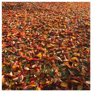 【1枚目】この木の下は、【2枚目】このような葉っぱで、【3枚目】このようになっていました😲 歩くと靴が埋まります😅 モミジバフウですかね🧐(農業試験場内にて)