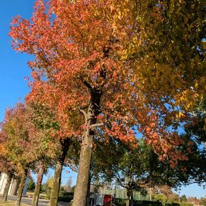 🍁モミジバフウ🍁 葉が紅葉の様で和名の(紅葉葉風)由来にもなっている〜木全体がグラデーションになり美しく、近づくと、3センチくらいのイガイガの実がぶら下がってました〜🤎🤎