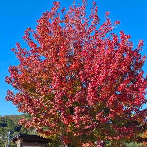 2025.11.4 Tuesday ☀️ 空一面真っ青 すっごく良いお天気です。 公園の大きな木 モミジバフウの葉っぱが真っ赤になりました。 写真撮りすぎてバッテリーなくなりそうです。 ウキウキする真っ赤な秋🍂 カレンダーは初冬でしょうけど…