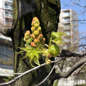 モミジバフウ(アメリカフウ)の雄花 雌雄同株 (雌花、雄花両方つく)だったんですね(´・∀・`) 雌花はあいにく光の加減で一緒には撮れませんでしたが 雄花の下方に着く様です 一緒に撮れたら分かりやすかったのですけどね💦 もうあのオーナメントの様な可愛らしい実がぶら下がって 着いているところもありました♪