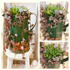 おはようございます😃 新成人のみなさん、おめでとうございます㊗️ でも、あいにくの雨☔️☔️ メリーも、つい数年前に成人式を・・・👊💥 あっ、いや失礼致しました〜🙇♀️ 今日のpicは、レディハート(斑入りハートカズラ)とハオルチアの寄せ植え🌱 室内用の寄せ植えにしたくて、この2つを選びました🖐 ただ、思いの外レディハートが長く育ち過ぎて・・・💦 ハンギングにしたらいいのだけど、置き型にしたいし〜😅 背の高い器を探していたら、以前トールペイントしていた時に巻きバラを描いたブリキのピッチャーが見つかって😳 さっそく寄せ植え🌱🌱 背が高いので、半分くらいは軽い鉢底石が入ってます🖐 でもこうしてpicで見ると、ちょっとごちゃごちゃしてる・・・😱 器はあくまでも多肉を引き立てるサブキャラの方がいいよね〜💦