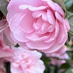 乙女椿のような八重咲きピンクの山茶花が咲き、 野菜畑のお隣では、満開になってお見事です❗️