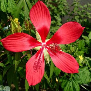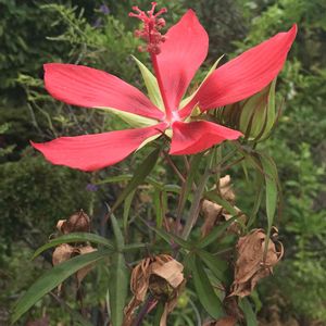 モミジアオイ…北アメリカに分布するアオイ科フヨウ属の多年草。 花は同属のハイビスカスに似ています。 花は、一日花ですが花期の間次々に蕾が付き、開花します。 花色は赤のほか、白、ピンクがあり。近年では、アメリカフヨウとの交配種で、花弁の幅の広い品種も流通しています。 また、沼地に多く自生することから、沼ハイビスカス(swamp hibiscus)とも呼ばれています。 モミジアオイの花期は7月~9月。 花期になると、茎の上部の葉の付け根から花柄を伸ばし、花径10~20㎝程度の大きな花を咲かせ、花は5枚の花弁を持ち、中心には特徴的なしべがあって。しべは多数の雄しべが癒合して筒状になっており、その先端部分に雌しべがあります。 雌しべの柱頭は5裂しており、合着した柱状のしべは長く突出します。