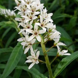 庭に変わった咲き方の白い花が咲きました。調べると丘虎の尾のようです。この曲がった咲き方は凄いですね。