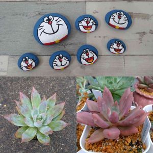 本日2枚目😝 🏷ドラえもん誕生日 探すより、石ころを塗った方が早い😆😆 ↙ワイルドコロラータ 葉っぱが細いですね。 ↘ピンクダナ どちらも雨でびっしょり☔