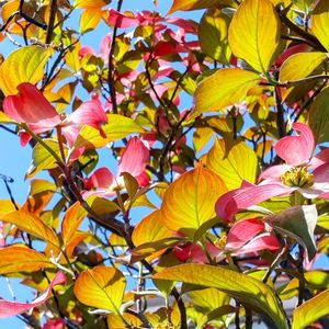 こんにちは 今日のお花 「ハナミズキ」 我が家のハナミズキです 今年のハナミズキは 酷暑と強風で傷みが激しくキツイ剪定をして花芽まで切ってしまったので 花が少ないです 陽光を浴び透けたハナミズキの葉も美しいですね 中央のハナミズキの花 可愛い花が咲いていますよ 花が終わった6月くらいから小さな花芽がつき 酷暑の夏を過ごし 爽やかな秋を過ごし 厳寒を耐え 花を咲かせてくれてありがとう 今日は陽射し眩しく 暑くなりました 今盛りのハナミズキ 長く愛でたいな 季節の変わり目 ご自愛くださいませ