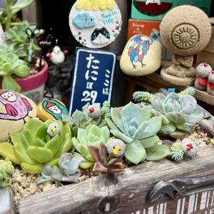 こんばんは🌙.*·̩͙.。★*゚(ᴗ͈ˬᴗ͈❀) 🏷石の日 先日、行ったフラリエ ハンドメイドフェスタでの戦利品と 🏷エッジローfukuジロー 石ころちゃん と45ちゃんからの石ころ だるまさんは前に頂いていて、 今回、 アンパンマン(● ̍̑● ̍̑●)と カオナシ が加わりました。 月の雫ちゃんのイシコロタン、オジゾータン はレギュラーだね💕︎ 2枚目 下段の桜吹雪とサボテン🌵は 多肉屋さんの1回200円のガチャガチャ 3枚目 たにく ふぁーむさんにて インスタフォローしていると貰えた チョコレート と ホワイトオレンジ 4枚目 ハンドメイドフェスタで 買い物🛒𓈒𓂂𓏸をして、毎回スタンプを押してもらい、3つ揃うと 色々な商品と交換出来るので 今回は渋い感じで一目惚れしたサボテン🌵と交換してきました。 5枚目 我が家の柿の木🌳です。 まだまだ実は青くて食べれないの ですが、カラス🐦⬛が青くても実を 落として食べて行くのですが💦 めっちゃくちゃ汚くなるので 来ても食べれないように網を張りました💦 夫と2人2時間ぐらい🪜梯子に登って網掛け、なんだか疲れた〜疲れた😵💫