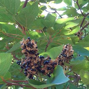 「アカメガシワ」の実🥑 真っ黒で、美味しそうには見えませんが、ヒヨドリや、ノバトは好んで食べます😅 トウダイグサ科の落葉小高木🌱 公園や森や山に面した林道や道路沿いなどどこにでも見かけますね これが、意外と優れもの🌱🥑 木材は薪炭などに、樹皮は薬として、新芽は山菜🌱葉は食糧を包んだりするのに使われていました。