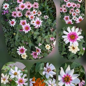 我が家のジニアたち。 左上のプロフュージョンは毎年育ててますが、イベントでもらった種は大輪咲きのジニアだったようです。 ご近所さんに「ダリアが素敵」と間違われるほど華やかです。