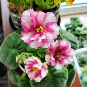 セントポーリア RM-シャルロッテさん、4輪目が開花(1輪目は折れてしまった💦)しました。 多花性ではない様で1本のストーク(花茎)にお花が1~2輪ずつという感じですが、咲いてからお花が徐々に大きくなって大輪になる&ピンクの模様がキレイに入ってロリポップっぽくて可愛い&八重がしっかりキレイに広がり花形が整っている&花持ちがいいので、今とてもお気に入りの品種です。