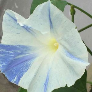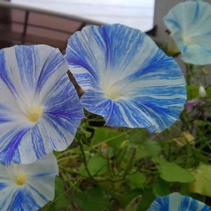 青と白の絞り模様の 西洋朝顔 「フライングソーサー」 日本種の朝顔より 開花時間が長く 昼を過ぎても 咲いています💙