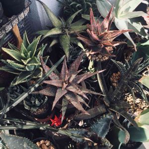 1 お気に入りの斑入りストリアータ(慈光錦)。 くちべにアロエという商品名でも出回っています。 持っているのに見かけると欲しくなるやつ。 うちの環境では寒さに弱く、先代は寒の戻りでお亡くなりに😢 この株は数年を経て、ようやく扇型を卒業しました。 直径30cm程ですが、まだ大きくなりそうです。 2 長い事うちにいるシンカターナ交配錦。 この手の斑入りアロエは似たり寄ったりで区別がつきにくい。 シンカターナ錦だと全然変わります。 これも直径30cm程。 ストリアータと違い、良く増えるし良く刺さる。 3 ずっと欲しかったカスティロニアエ。 はるこう先生にいただきました。 東側で焼けて、ちょっと怪しい感じの色になっていました。 北側に移動したら、肉厚でキレイな緑色になりました。 仔株でなくて本体が送られてきたのでは?😳と思うほど立派な株です。 交配してトゲトゲアロエを作るのが夢(*´-`)