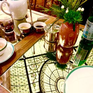 明けましておめでとうございます㊗️🍾 卯年でhopホップホップで前進あるのみ! 皆様のご健康をお祈りしています! パームコート プラザホテル アフタヌーンティー テーブル上鏡に反映される美しい天井 テーブルフラワーアレンジはシダー、ダイアンサス、セントジョーンズワート(ヒペリカムの実白色)