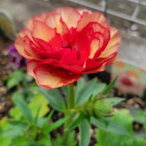 ラナンキュラスランドセル サラセレネ モノケロスの花が強風に耐えながらキラキラ✨ ビタミンカラーに元気がもらえる😃 サラセレネ イパリオンは、やっと蕾が上がって来たところ😃