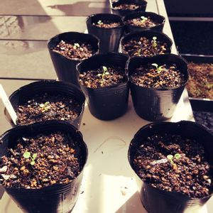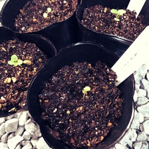 種まきして発芽してから 18日たちました 少しづつ大きくなってます 私なりのポットあげ 試してみてます どうなるでしょうか 緩効性肥料もまぜてみました