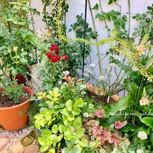 左の素焼き鉢の薔薇はナエマ… 2番花の蕾がいい感じの高さ♫ この辺りで咲いてくれると嬉しいよね♫