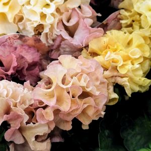 おはようございます✨☀️✨🐦️ 昭和風に言うと花の金曜日✨☀️✨ 明日はお休みです\(^o^)/ 花の展覧会で見たフリルたっぷりのパンジー🍀 色あいがアンティックで大人色かな😘👠❤️ 近所にはない色あいです🥰
