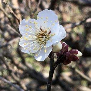 ウメの中で最初にお花が開いて、今は満開です。真っ白なウメ「冬至」をパチリ!🌼😊😄🌞✌️
