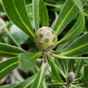 欲張り連投で<(_ _*)> プロテア、ピンクアイスに蕾が付きはじめました~😍 画像のような形が3個💕 このまま順調に成長してくださいねぇ~と願うばかりです😄 リトルプリンスもスクスクと育ってるので嬉しいです🥰 今年はフェイジョアの受粉作業を頑張りました~その成果あってぷっくり膨らんでるのが何個も付いてるのは嬉しいです🎵😍🎵何とか、収穫に至って欲しいなぁ~🍐