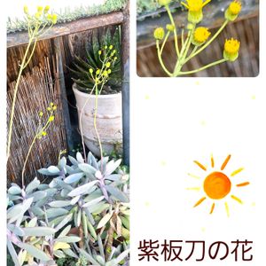 おはようございます 紫板刀の花は☀️みたいなお花です やっと花が開いてきました💝 薔薇のような多肉に 子沢山のセンベルです🎶 みんな違ってみんな良い💕よね。