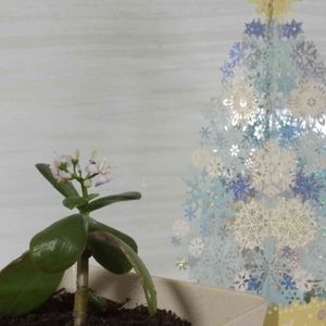 夫がもらって来た一枝、試しに挿してみたら、冬なのに可愛らしい花🌸が咲きました。 かねのなる木で合ってるのかな? 花友ちゃんから頂いたクリスマスツリー✨🎄✨と一緒に💙