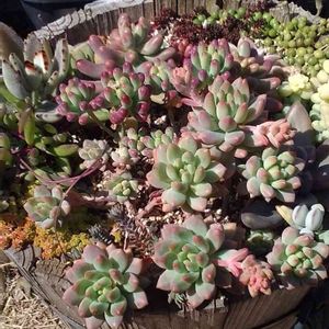 ちょっと見ないうちに、可愛く色付いて ました➰🎶🎵🎶♐️ 左から、ベビーサンローズ 、ダリーダル 大葉丸葉万年草〰〰 ミントベアー君も、嬉しそう💚
