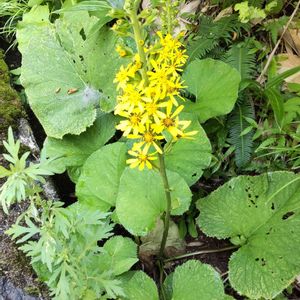 オタカラコウ(雄宝香) *キク科メタカラコウ属 花期は7〜10月 本州.山形県以南〜九州の山地や亜高山の谷川のほとりや湿気の多い場所に自生する。 高さは1〜2m 葉は長い葉柄があり大きく腎円形て、縁には細かい鋸歯がある! 茎の先に黄色い総状花序を多数付ける。 舌状花は5〜9個 (似たメタカラコウの舌状花は1〜4個) とても大きくて、よく目立ちます! 月山への林道そばに咲いていて車を止めて 撮りました♪ 7月27日撮影