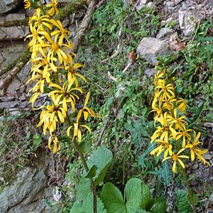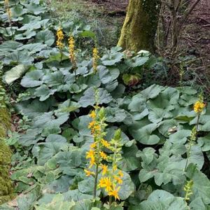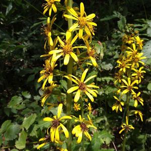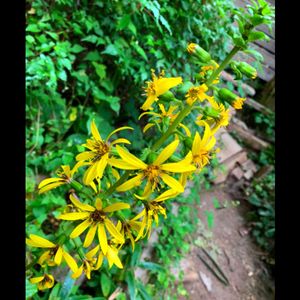 オタカラコウ♡雄宝香 キク科 防虫剤や香料にする宝香(樟脳)に 似た匂いが根にあるので名付けられたそうです。 少し湿り気のある林野に生えていました。 草丈が1.3㍍位あって 全体を撮せなかったのですが(左下に少し🌱) 葉っぱは蕗の葉に似ています。 黄色いお花もツワブキに どこかしら似ています。