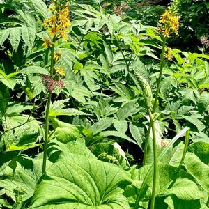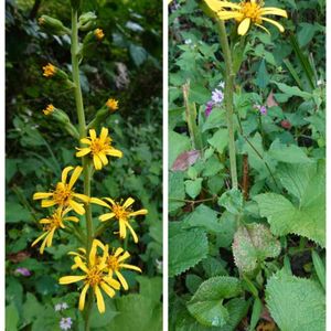 オタカラコウ(雄宝香) *キク科メタカラコウ属 花期は7〜10月 本州福島県以西の山地から亜高山帯の湿った湿原に自生する。 1〜2mほどの大型になり、葉はフキの葉に似ている。 似たメタカラコウは頭花の舌状花が1〜4個に対してオタカラコウは5〜9個ほど! 7/25撮影 山形県月山