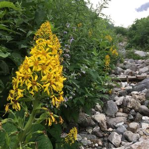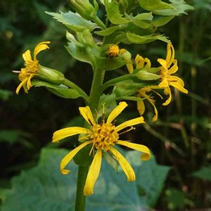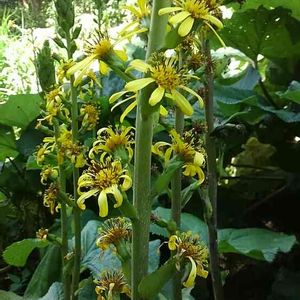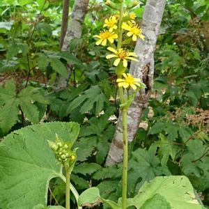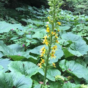 リグラリアに似てるなぁ〜 って思って調べたら、同じキク科メタカラコウ属でした🌼 雄宝香と書きます。 下のツヤツヤした大きな葉はミズバショウです。