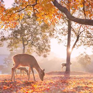 日の出を待ちわびて朝日を浴びる鹿ちゃん(*˘︶˘*)🦌💕 紅葉された景色と朝日の光が綺麗で可愛い鹿達にも癒されます✨✨
