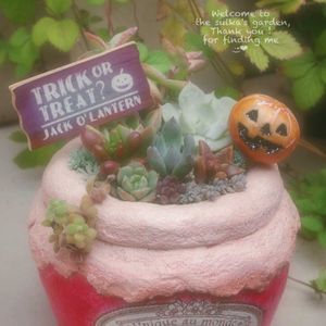 🍀寄せ植え🍀 夏越しした多肉ちゃんたちの寄せ植え💚 火祭りちゃんがメインです💕 かぼちゃとお揃いの毛糸🧶で 帽子編み編み🧡 ハロウィン~🎃 🏷️ ソクモン祭り 参加させて頂きます (∪_ ̫ _∪)♡