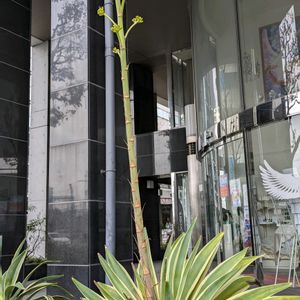これがあのアオノリュウゼツランだろうか? アオノリュウゼツラン リュウゼツラン科 メキシコ原産の大型植物(葉だけ見ているとそんなに大型ではない。) 茎がスルスル伸びて、花を咲かせている 開花に数十年かかり、開花の後は枯死するという。 天満橋のビル前の植込みで。