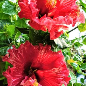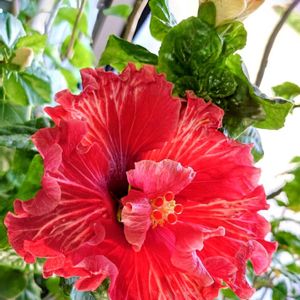 伊江島ハイビスカス 紅孔雀 今日の朝 大きく開きました 凄く美しいです 花びらがフリンジで 中央が バタフライ種のように なっています うっとりします♪ヽ(・ˇ∀ˇ・ゞ)🩵🩷🩵