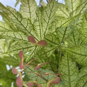 ご近所散歩🚶♀️ 初めて見る斑入りモミジです 塀の上から覗いていました 葉脈の模様が透けて見え涼し気です ヤマモミジ系の園芸品種