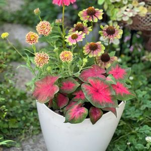 こんばんは♪ 今日も暑すぎました🥵 向こう1週間の予報では35℃以下は無いです(@_@)💦 鉢植えは軒並みカラカラ…路地もこのままでは砂漠状態になりそう🐫 夕方でも南側では暑くてシェードで撮りがちです😅 ④ 昨日作った寄せ植えを♪ 毎年カラジウムが欲しくて初めて迎えました😊 ピンクとグリーンがテーマ、カラジウム主役の寄せ植え✨🩷💚 ③ガイラルディアのガリアシリーズも投稿で良く拝見してて…初めましてです🎶ふんわり可愛らしい〜🥰 ②グリーンのエキナセアはいつも枯らしがち💦 今度こそお願い🙏 ⑤普通のエキナセアだけどテーマカラーなので😉 夏っぽく出来たかなぁ〜⛱️ 早いもので今年も折り返し💦 今月もありがとうございました😊