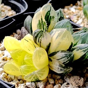 ●ススキノキ科 ツルボラン亜科 ●ハオルチア属 ●オブツーサ錦😻😻 (3頭) こちらは3頭のオブツーサ錦。😍😍😆 ご覧の通り、子株が全斑…🤣🤣🤣 2頭のオブツーサ錦も子株が全斑でした…😅😅😅 困りましたね…🤔🤔🤔🤔🤔