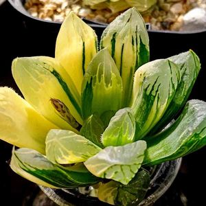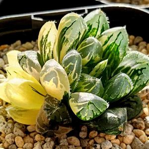 ●ススキノキ科 ツルボラン亜科 ●ハオルチア属 ●オブツーサ錦😻😻 (3頭) こちらは3頭で、一つ前の投稿の兄弟株。😁🤭 奥の子株はほぼ錦。🤔🤔 どう育つかな。