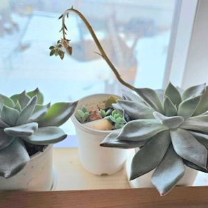 お日さま不足 せっかくのかわいこちゃんもびろーん 花芽が次々あがってくる時期ですね 私にしてはこの子だけ切りたいのをグッとこらえています ひとつだけ咲いたらすぐカット✂のつもり 花色を確認したいただそれだけなんだけど 親株が弱らないのを祈るばかり