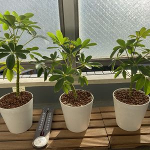 唯一屋外越冬ちうのDAISO出身シェフレラ三兄弟🪴。気温1桁の日もあるのに新芽が次々育ってます。このままたくましく大きくなって、殺風景なベランダの緑化にがんばってね💕