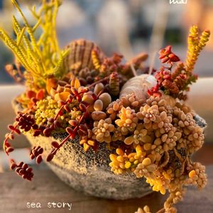 1pic 12月現在今年5月に作った寄せ植えの7ヶ月後です 2pic 7月 3pic 5月 sea story(海物語)←寄せ植えタイトル 何で海物語かって言うと まぁ…何ちゃら島の貝を沢山貰って余っていたので使ってみたって感じです 以前より、寄せ植えに貝を足すと何故か調子が良いというウチだけの伝説があり 実際、この鉢で植えたら普及種すら上手く育たないと言う実績3回を持つ不吉極まり無い鉢に寄せ植えしたのだが、貝を入れるとこの様に夏越し楽勝みたいな嘘か誠か、ビックラポンなのです たまたま何らかの偶然が重なっただけ… と、考える方が賢明ですが( ̄∇ ̄) 突然復活したかと思えば連投すみません marは、夏場生きる屍な為 活動期間はダッシュしてしまいがちです。 ここ数日で太陽を存分に浴びて、セロトニンの生成もうまく出来て、興奮が止まらない脳みそが夜休む事に気付いてきた様子 厄介な脳みそです🧠 今日やっと夏場フル活動していた、大きなサーキュレーターも片付けて、冬モードの太陽に合わせた大規模な多肉配置換えもかなり進みました、来週の休みには全て終わらせて、チマチマ下葉取りとかしたいなぁ〜寄せ植えなどは春までお預けって感じです