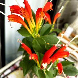 園芸館の中で、ミッキーマウスツリーなんてあったっけ⁉️と思いながら近づくとこれでした😊 吊り鉢の観葉植物、エスキナンサスの花だったんです。 こんなに派手な花が咲くんですね。 イメージは白い小さな花なんだけど。 イワタバコ科📝私が知ってる花だとストレプトカーパス、確かに花の形が似てる。 それにしても、このエスキナンサスのボリューム、上の方からはどんどん新葉🌿が展開してるし、よく見ると👀斑入りの葉もある✨✨