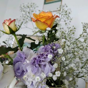 🏷️月曜日は元気色の花 🏷️月曜日は玄関の花 🏷️薔薇愛同盟 週明け…月曜日 また今週も~4649お願いいたします(*^^*)🙋🏻♀️🤗💞 カスミソウ 🌹🧡❤️バラ トルコ桔梗💜🌿の花…で
