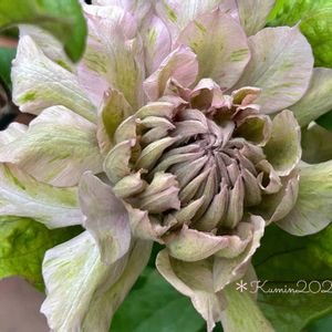 八重咲クレマチス"はるかすみ" 色変してきた様子です(*ฅ́˘ฅ̀*)♡︎ 一連の様子、みどりのまとめに投稿しました🌿 お時間のある方、見ていただけたら幸いです💓