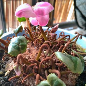 シクラメンの球根のすぐ上に顔を出す たくさんの花芽達🩷まるで高原植物のようでもあり、とっても可愛くて気に入ってます🥰 管理の仕方をどこでどう間違ったのか、、背の低い子達ですが百花繚乱に咲き続けてくれるのを楽しみにしています🎶😌