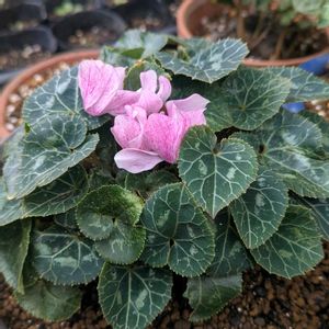 昨日、 思っていたより早く用事が終わり 大型ガーデンセンターへ🚙 旅行前に 八重白花ガーデンシクラメンを 買っていたが‥やっぱり欲しい〜! ①ぐるぐると迷って歩きまわり 淡いピンク花を選ぶ→ 濃い葉色との対比が気に入った 名前は、忘れた💦 ②原種系の濃い色のコウムも^ ^ 花数の多いものを吟味 ③シーズン初め 球根で買ったコウムは ただ今、こんな感じ ④夏越し何年かも、色も⁇ 花芽ついておくれ〜 そう言えば‥ 種を周りに埋めていた チビ葉がひとつ出てるワ ⑤こちらは、確か‥白フリル⁈ 花芽ありで、答えはわかりそう